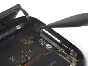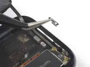 Используйте пинцет, чтобы снять скобу разъёма батареи.