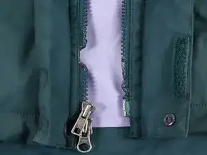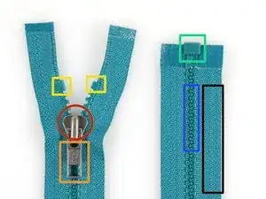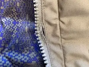 На этой фотографии лента молнии разорвана рядом с пластиковыми зубьями. Единственный способ окончательно устранить эту проблему — заменить всю линию молнии.