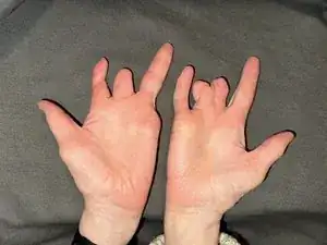 На левой руке перепонка между указательным и средним пальцем была удалена, поэтому точка разделения пальцев расположена ниже, чем обычно.