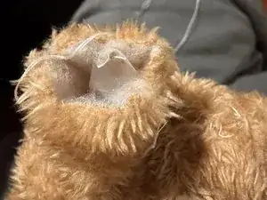 Используйте небольшой кусочек ткани от отсутствующего мизинца, чтобы заполнить промежуток между перепончатыми пальцами. Я также использовал небольшую пластиковую карту, чтобы не протыкать швейную иглу через пластиковый пакет.
