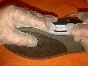 Возьмите суперклей и обведите край подошвы, где она отделяется от кроссовка Converse.