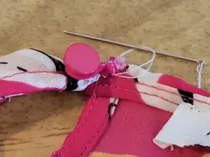 Протяните иглу через шовную линию, где петелька была изначально закреплена, затем снова через основание петельки, не менее 6–7 раз.
