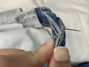 Введите иглу между слоями ткани и протяните её к внутренней стороне, закрепляя слои ткани вместе.