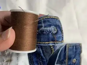Подберите нитку, максимально совпадающую по цвету с ниткой на брюках.