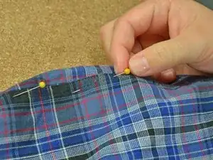 Зафиксируйте два слоя булавками. Убедитесь, что булавки захватывают только те два слоя ткани, которые нужно сшить.