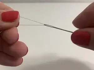 Возьмите примерно длину нити, равную длине руки, чтобы её хватило для шитья.