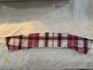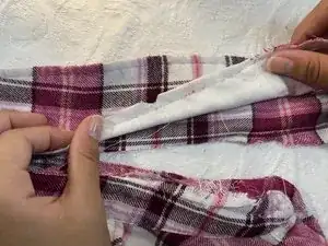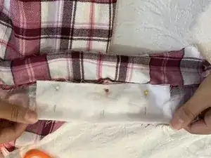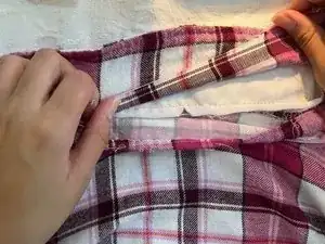 Вырежьте кусок ткани размером с повреждённый участок и положите его на внутреннюю сторону повреждённого участка воротника.