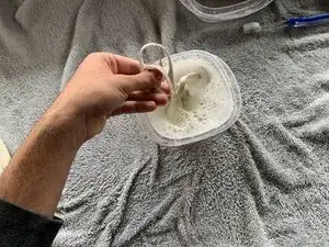 Возьмите новую ёмкость с тёплой водой и смочите ручное полотенце, чтобы удалить грязь, оставшуюся от мыльной воды.