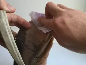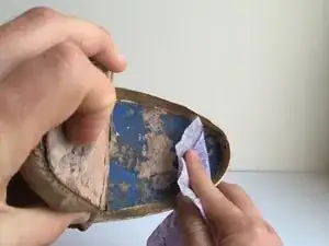 Нанесите тонкую полоску клея вдоль верхнего края подошвы и на внутреннюю поверхность подошвы.