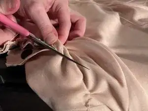 Обрежьте лишнюю ткань с помощью ножниц для ткани. Оставайтесь примерно в сантиметре от строченой линии, чтобы случайно не порезать нитку.