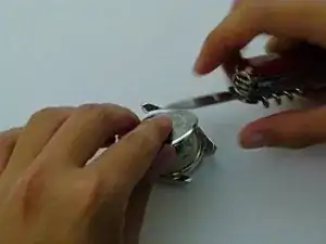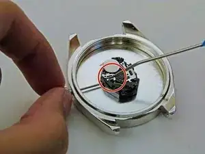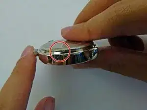 Надавите острым инструментом в отмеченном месте — вокруг места соединения заводной головки с корпусом часов.
