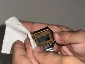 Протрите поверхность часов бумажным полотенцем, смоченным изопропиловым спиртом.