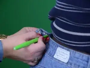 Будьте осторожны, чтобы не проколоть булавкой джинсы насквозь. Булавка должна проходить только через внутренний слой пояса.