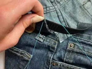 Это можно сделать, вводя иглу туда и обратно через резинку и пояс джинсов. Смотрите это руководство по выполнению ручного прямого стежка.