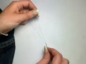 Протяните нить через ушко так, чтобы оба конца нити встретились.