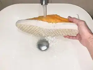 Достаньте обувь и промойте ее прохладной водой с мягким моющим средством, чтобы удалить избыточную краску.