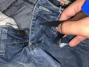 Сделайте три отверстия, используя острую часть портновских ножниц, на левой планке застёжки джинсов так, чтобы они соответствовали пуговицам на правой планке.