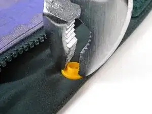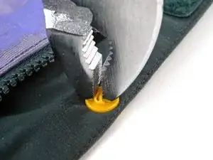 Используйте плоскогубцы, чтобы раздавить пластиковую кнопку, пока она не ослабнет и не выйдет из ткани.