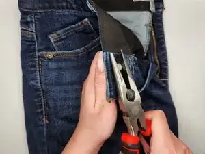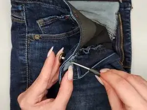 Выполните 10 шагов, приведённых ниже, чтобы узнать, как снять пуговицу с джинсов, заделать осыпавшееся или повреждённое отверстие для заклёпки и установить новую пуговицу. Если, как и автор, вы не умеете шить, не беспокойтесь: для этой починки игла и нитки не требуются.