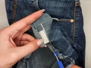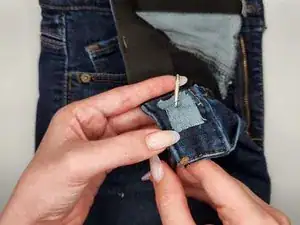 Приложите горячий утюг к тканевой ленте, покрывающей осыпавшуюся часть отверстия для заклёпки джинсов.