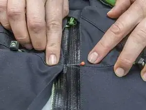 Выровняйте другую половину куртки, соединяя две стороны вместе с помощью шва, который сходит вместе, или другого элемента дизайна. Это важно, чтобы замок был правильно выровнен в конце.