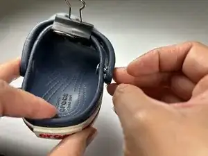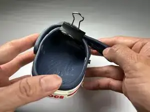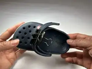 Переверните ремешок Crocs к передней части сандалии и зажмите ремешок прищепкой для бумаг, чтобы зафиксировать его.