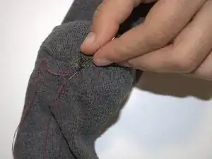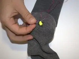 Вставьте иглу с внутренней стороны носка у края дырки не дальше чем в полсантиметра от края.
