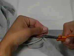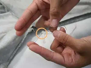 Теперь, когда вы определили конец оставшейся нити, отрежьте нить у кончика иглы. Будьте осторожны, чтобы не проколоть пальцы.