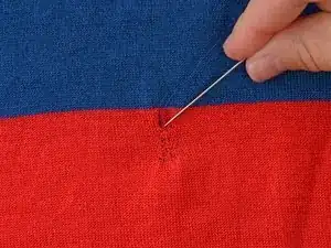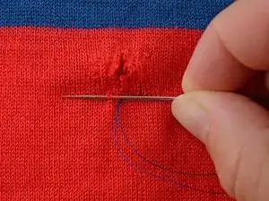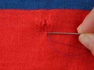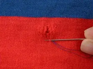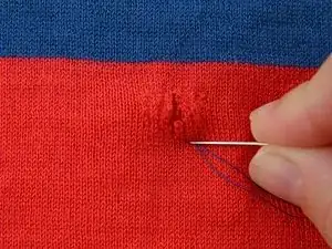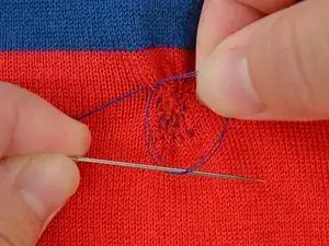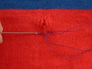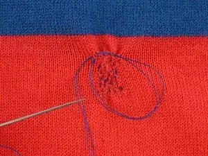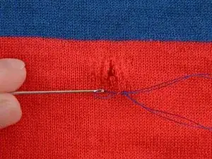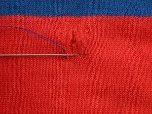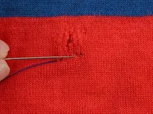 Сделайте один прямой стежок, проходя через один слой ткани и выходя на один ряд вязанья ближе к дыре.