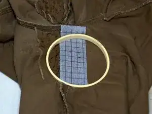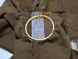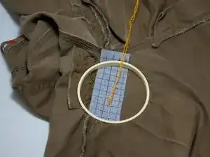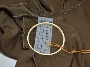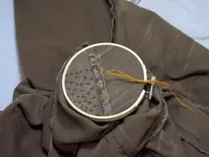 Используйте пяльцы и закрепите заплатку на штанах.