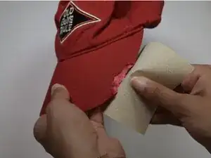 Быстро совместите заплату с поврежденным краем козырька так, чтобы оригинальный материал козырька оказался зажатым между сторонами картонной заплаты.