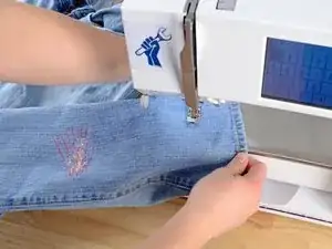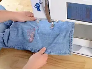 Как и раньше, в конце каждой линии стежков поднимите прижимную лапку, поверните джинсы на несколько градусов и зашейте еще одну линию стежков.