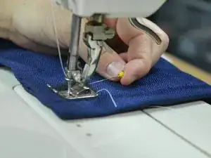 Продолжайте прострочку ленты. Когда дойдёте до конца стороны, опустите иглу в ткань и поднимите лапку. Затем поверните ткань на каждом из оставшихся углов.