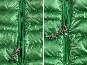 Переместите ползунок так, чтобы он находился выше повреждения. Установите витой верхний стопор выше и ниже повреждённого участка, соединяя обе стороны молнии. Куртка теперь наполовину застёгивается как пуловер!