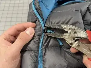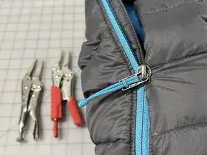 Навык - Зажмите верхнюю часть ползунка одной парой тонкогубцев или тисков с игольчатыми губками, а нижнюю часть ползунка — другой парой тисков, следя за тем, чтобы ни одна ткань не была захвачена.