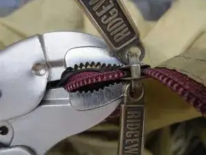 С зафиксированными плоскогубцами: используйте регулировку винта сзади, чтобы зажать бегунок молнии. (Убедитесь, что вы зажимаете только бегунок, а не ручки молнии или ткань.)