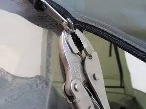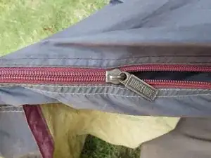 Молния, которая расстегивается за бегунком, как показано на этой палатке, является очень распространённой неисправностью на рюкзаках и чемоданах. Это легко исправить с помощью плоскогубцев: цель заключается в том, чтобы аккуратно сжать верхнюю и нижнюю пластины бегунка немного ближе друг к другу.