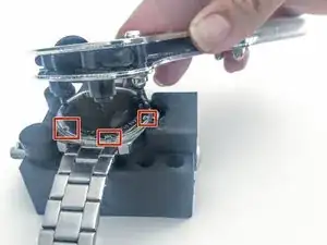 Совместите зубцы с маленькими выемками на задней стороне часов, слегка нажмите и открутите заднюю крышку.