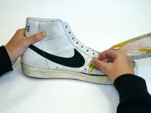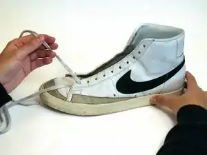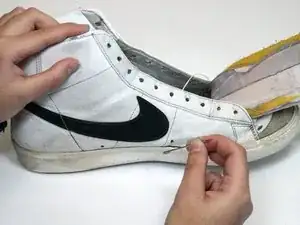 Развяжите и снимите шнурки с повреждённой обуви.