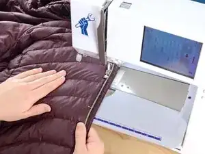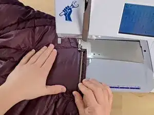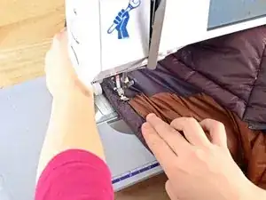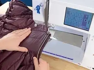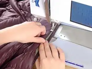 Разместите куртку в швейной машине так, чтобы лента молнии была сверху.