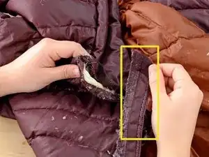 Найдите место, где клапан молнии всё ещё пришит к куртке. Используйте распарыватель, чтобы освободить клапан молнии от куртки. Жёлтый прямоугольник на фотографиях выше поможет Вам определить клапан молнии.