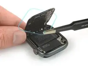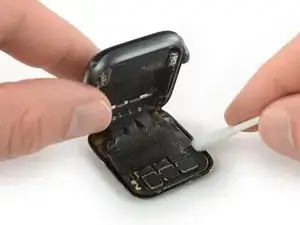 Вероятно, датчик Force Touch прилипнет к рамке дисплея, а не к корпусу часов. В этом случае вставьте открытку под дисплей и аккуратно отделите прокладку Force Touch от дисплея.