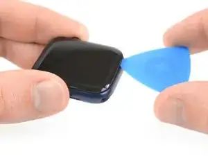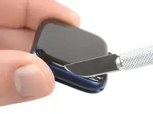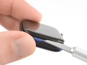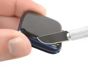 Вставьте край изогнутого лезвия в тонкий зазор между дисплеем и внешним корпусом. Начните с короткой стороны дисплея, самой удалённой от цифровой коронки.