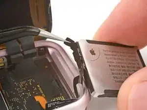 Используйте одно плечо наклонных пинцетов, чтобы осторожно приподнять ленту в верхнем правом углу батареи.