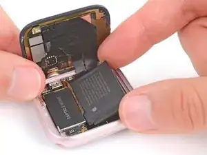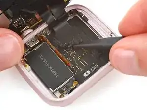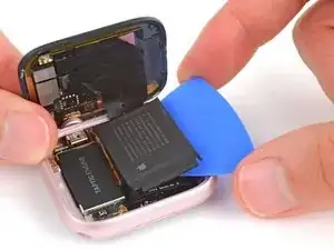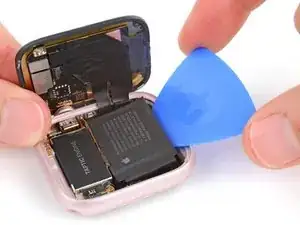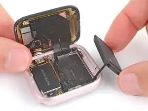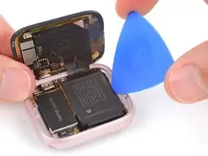 Аккуратно приподнимите батарею из её посадочного места и положите рядом с часами, чтобы получить доступ к кабелю батареи.