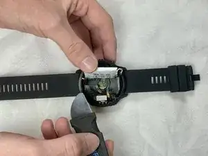 Сначала вам нужно будет снять материнскую плату, чтобы получить доступ к аккумулятору. Для отключения аккумулятора вам понадобятся ножницы, а для повторного подключения — паяльник. Обязательно определите, какие провода подключаются к каким клеммам часов, прежде чем их удалять. Будьте крайне осторожны при пайке, чтобы не капнуть припоем на другие части часов. Также соблюдайте особую осторожность, чтобы не порвать шлейф внизу при извлечении аккумулятора. При снятии аккумулятора следите, чтобы не повредить его.