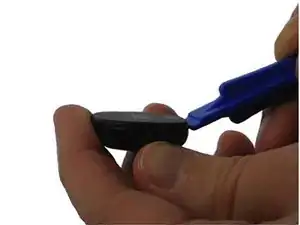 После освобождения модуля трекера из ремешка снимите заднюю крышку модуля с помощью пластикового инструмента для открытия. Изогнутый край инструмента должен быть направлен к задней части устройства, чтобы не поцарапать передний дисплей.