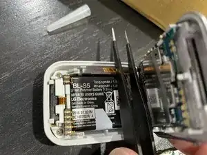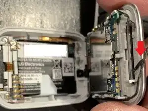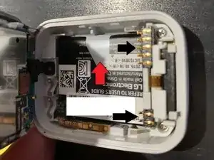 Установите новый аккумулятор и совместите провод с корпусом часов. Есть 2 углубления, куда нужно установить провод. Когда все части закреплены, просто защёлкните крышку обратно и проведите тест. Убедитесь, что всё работает, включая звонки, сообщения и сенсорный экран.