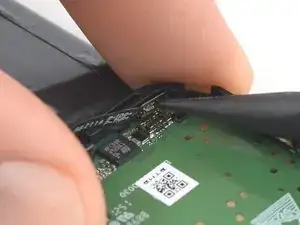 Если сложно поддеть аккумулятор, приложите нагретый iOpener к материнской плате, чтобы ослабить клей под ней. Не прикладывайте iOpener непосредственно к аккумулятору.