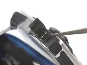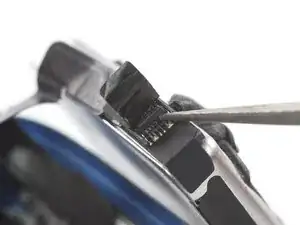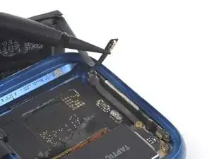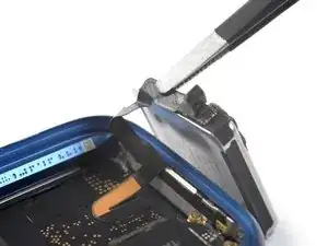 Используйте одну сторону пинцета или острый конец лопатки, чтобы приподнять фиксирующую планку ZIF-разъёма, удерживающую кабель аккумулятора.